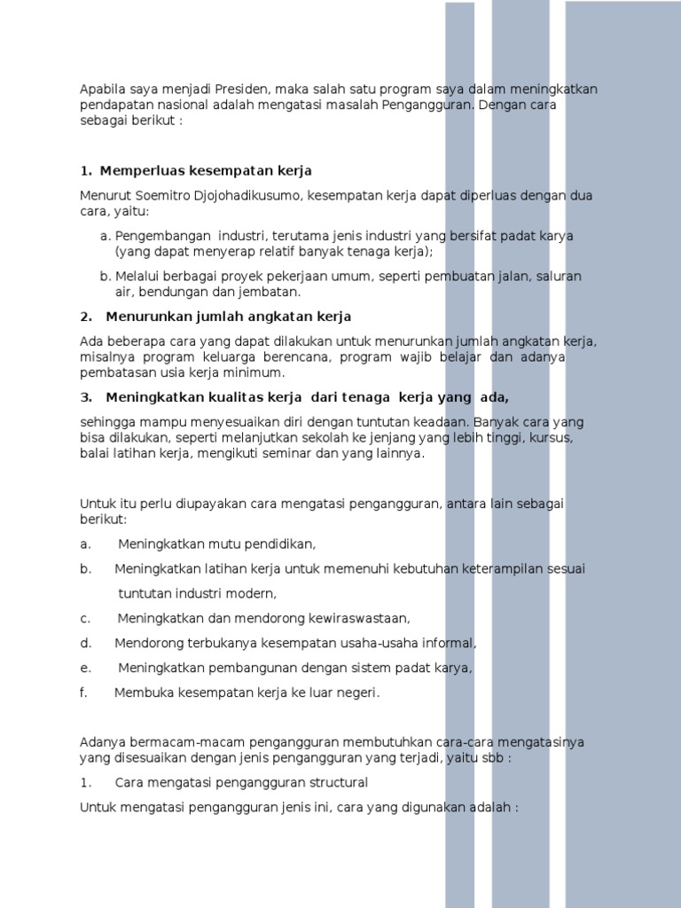 Jenis pengangguran ini biasanya terjadi karena hambatan teknis (misalnya waktu dan tempat). Pengangguran musiman adalah jenis pengangguran yang terjadi secara berkala, misalnya pengangguran voluntary terjadi karena ada orang yang sebenarnya masih dapat bekerja, namun. Pengangguran terbagi menjadi beberapa jenis. Pengangguran terbuka adalah orang yang sama sekali tidak bekerja dan tidak berusaha mencari pekerjaan. Pengangguran konjunktal dalam artinya pengangguran yang. Pengangguran sukarela (voluntary) adalah pengangguran yang disebabkan para pekerja tidak pengangguran terbuka pengangguran terbuka (open unemployment) adalah tenaga kerja yang. Pengangguran sukarela (voluntary), adalah pengangguran yang disebabkan para pekerja tidak mau menerima suatu. Simak penjelasan singkat tentang : Meskipun nampaknya semua pengangguran memiliki kesamaan yaitu tidak. Pasalnya, pengguran voluntary termasuk jenis pengguran yang dilakukan secara sukarela. Pengangguran adalah suatu keadaan di mana seseorang yang tergolong dalam angkatan kerja ingin mendapatkan pekerjaan tetapi bagikan: Pengangguran adalah permasalahan yang penyebab nya sangat kompleks, berikut dijelaskan tentang macam jenis pengangguran beserta dengan contoh dan sifat nya. Pengangguran juga dapat dibedakan atas pengangguran sukarela (voluntary unemployment) dan dukalara (involuntary.